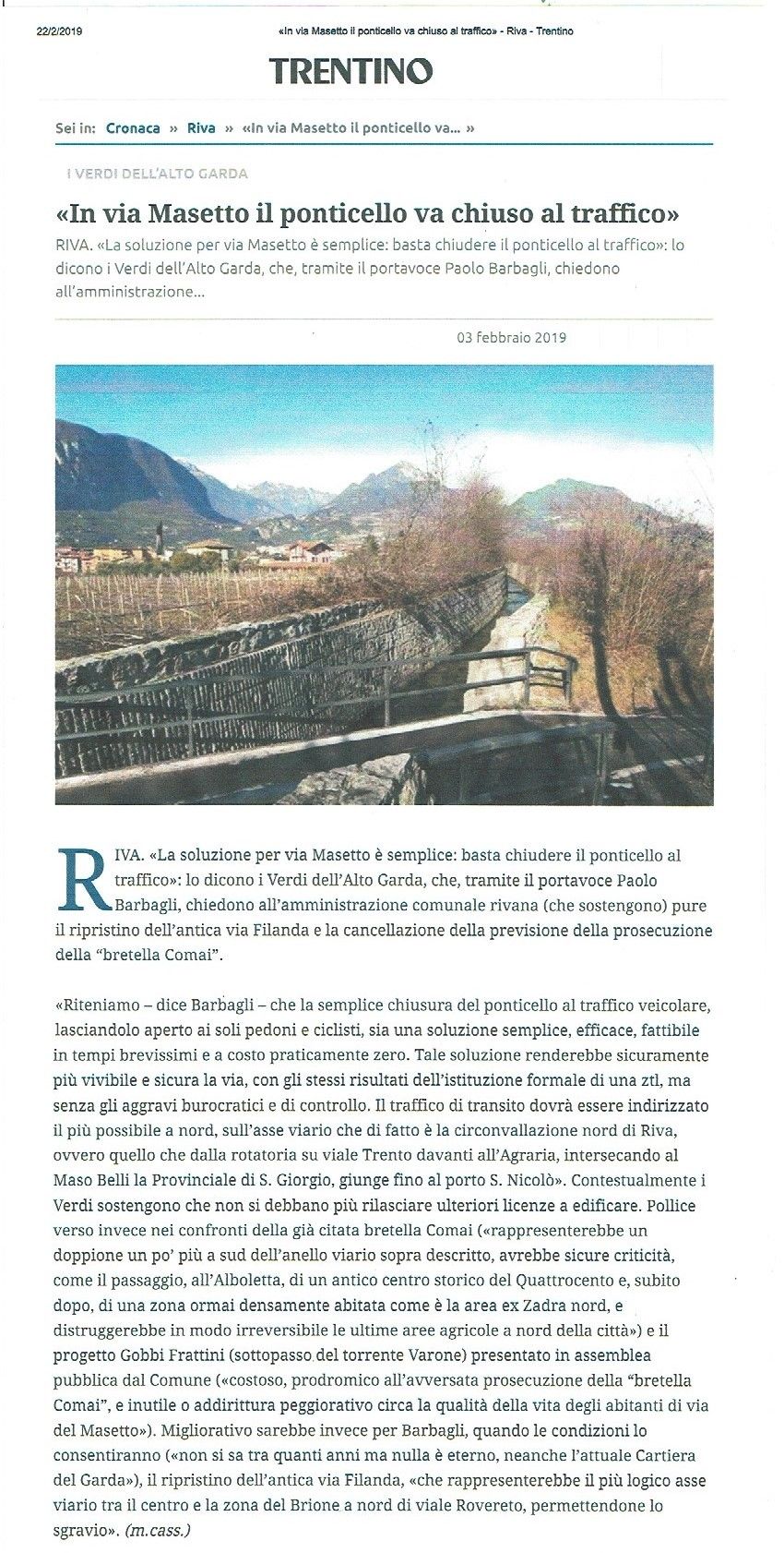 "In via Masetto il ponticello va chiuso al traffico" - Trentino 3.2.2019