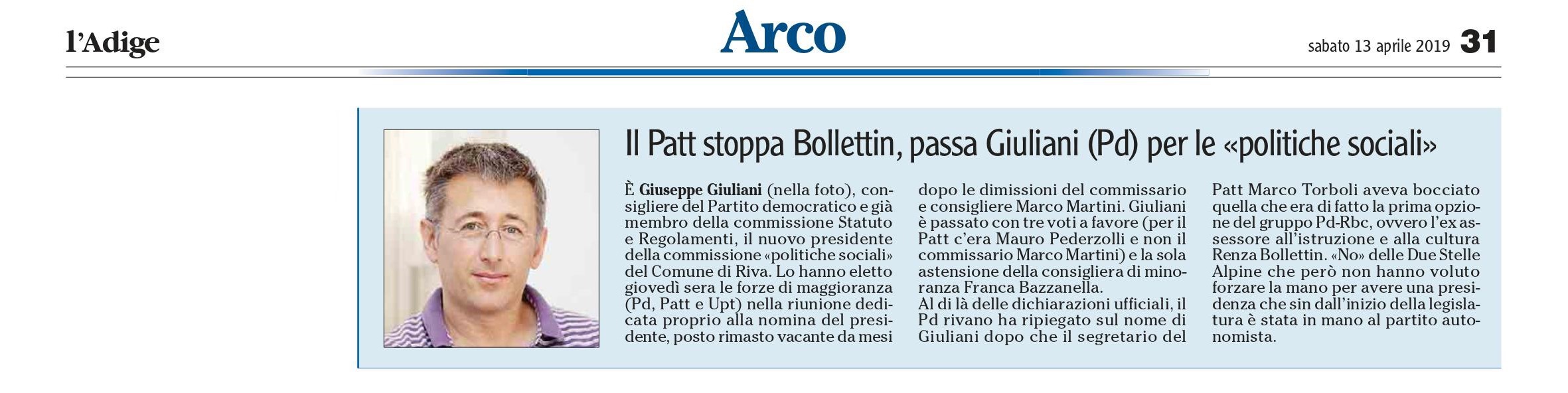 "Il PATT stoppa Bollettin, passa Giuliani (PD) alle "politiche sociali" - L'Adige 13.4.2019