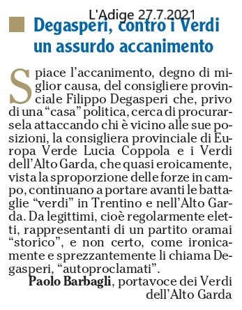 "Degasperi, contro i Verdi un assurdo accanimento" - L'Adige 27.7.2021