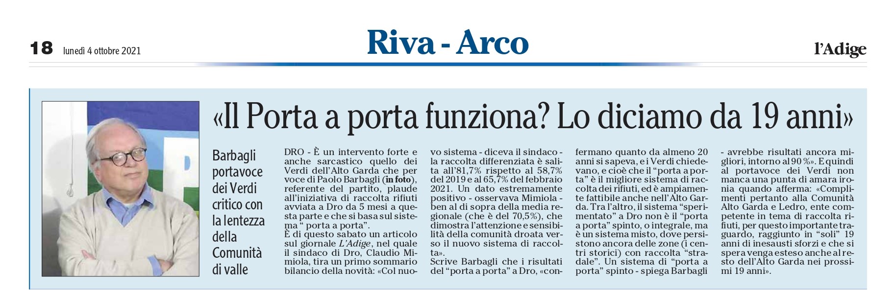 "Il porta a porta funziona ? Lo diciamo da 19 anni" - L'Adige 4.10.2021