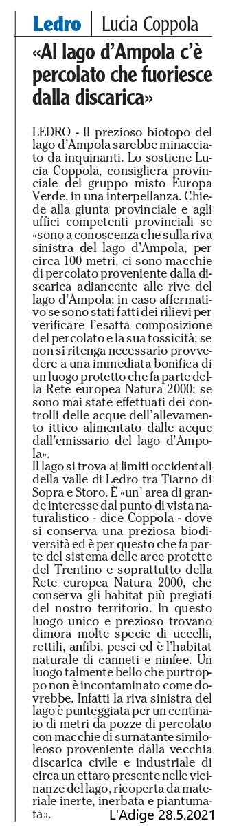 "Al lago d'Ampola c'è percolato che fuoriesce dalla discarica" - L'Adige 28.5.2021