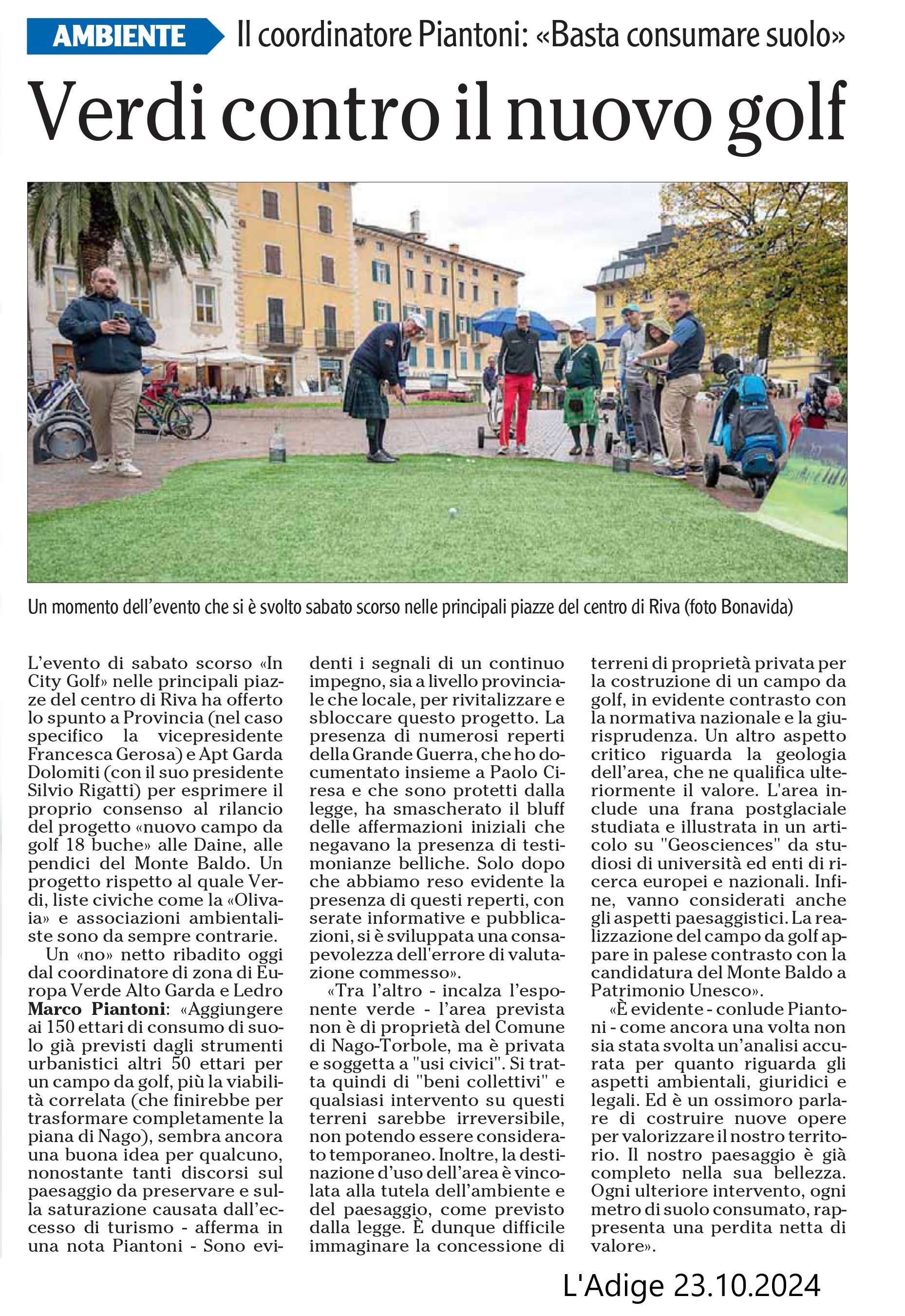 Verdi contro il nuovo golf - L'Adige 23.10.2024