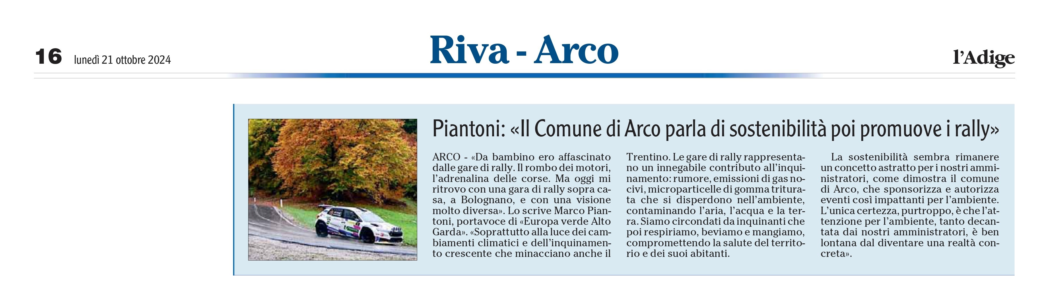 "Piantoni: Il Comune di Arco parla di sostenibilità poi promuove i rally" - L'Adige 21.10.2024