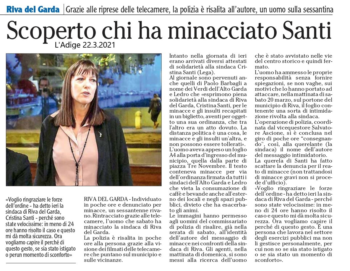 I "Verdi dell'Alto Garda e Ledro" esprimono piena solidarietà al sindaco di Riva del Garda, Cristina Santi, per le minacce ed insulti recapitati in un biglietto, aventi per oggetto una Sua ordinanza, che tra l'altro era un atto dovuto.